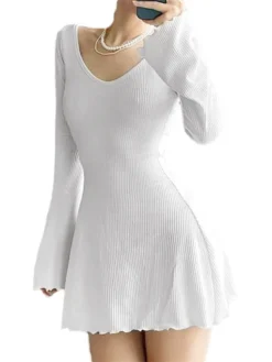 Women Summer Slim A-Line Dress, Solid Color Ribbed Long Sleeve V-Neck Slim Fit Mini Dress for Party, Beach