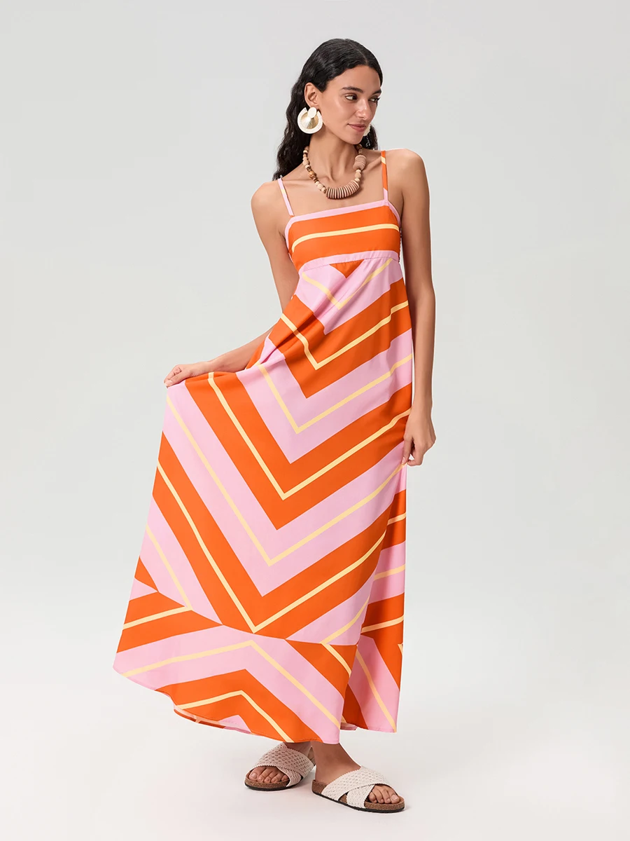 Women Cami Dress Stripe/Floral Print Spaghetti Straps Sleeveless Backless A-line Dress Summer Beach Holiday Long Dress