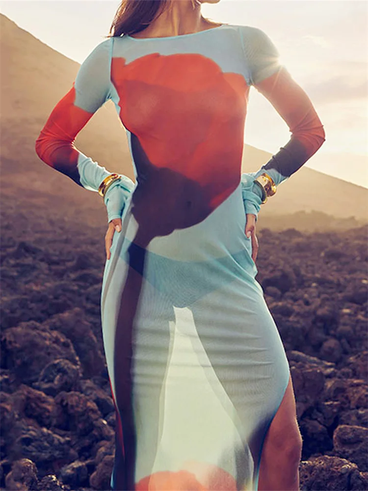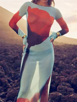 Womens Boydcon Long Dress Sheer Mesh Long Sleeve Boat Neck Floral Print Midi Dress Side Split Dress